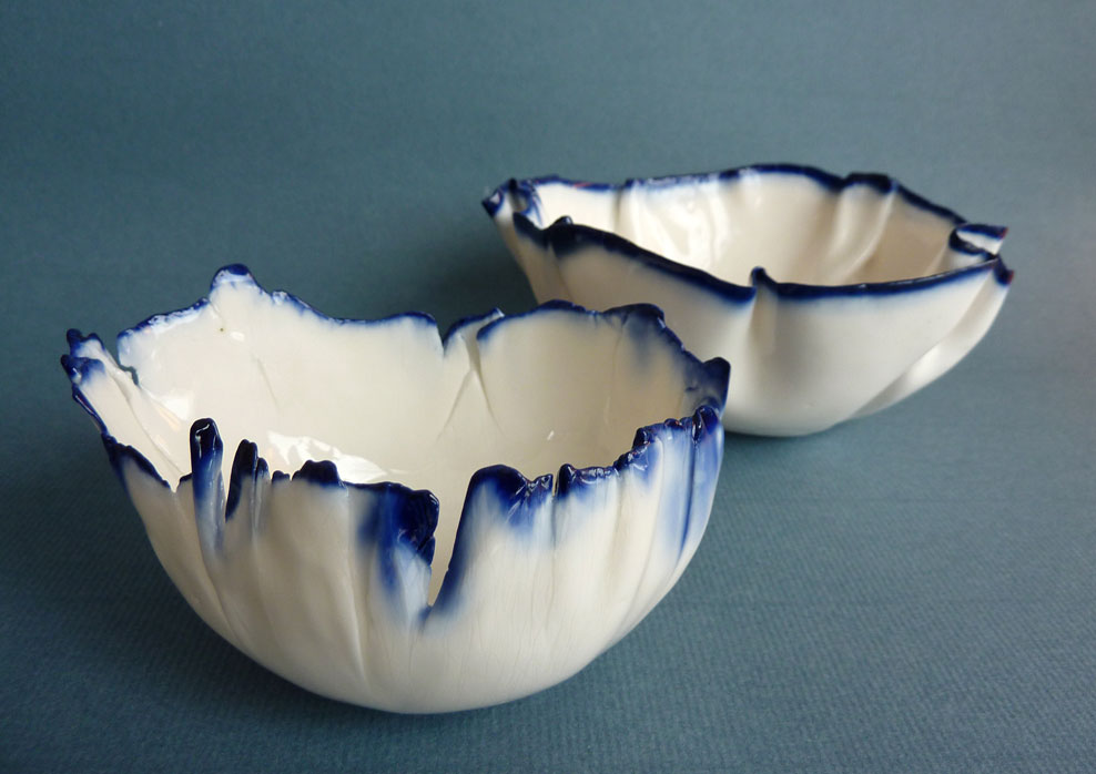 Sabine Kunkel-Zenker 2 Schalen, frei geformt, mit blauem Rand, 15cm